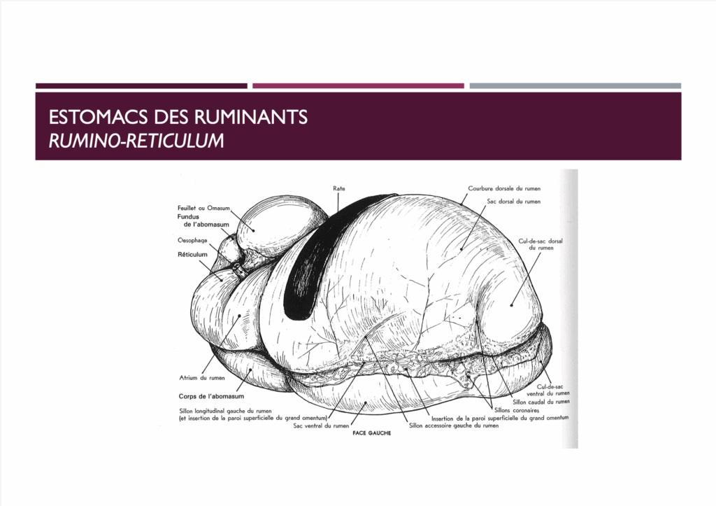 → Le rumen est très volumineux (jusqu’à 300 L), occupant toute la partie gauche de l’abdomen.